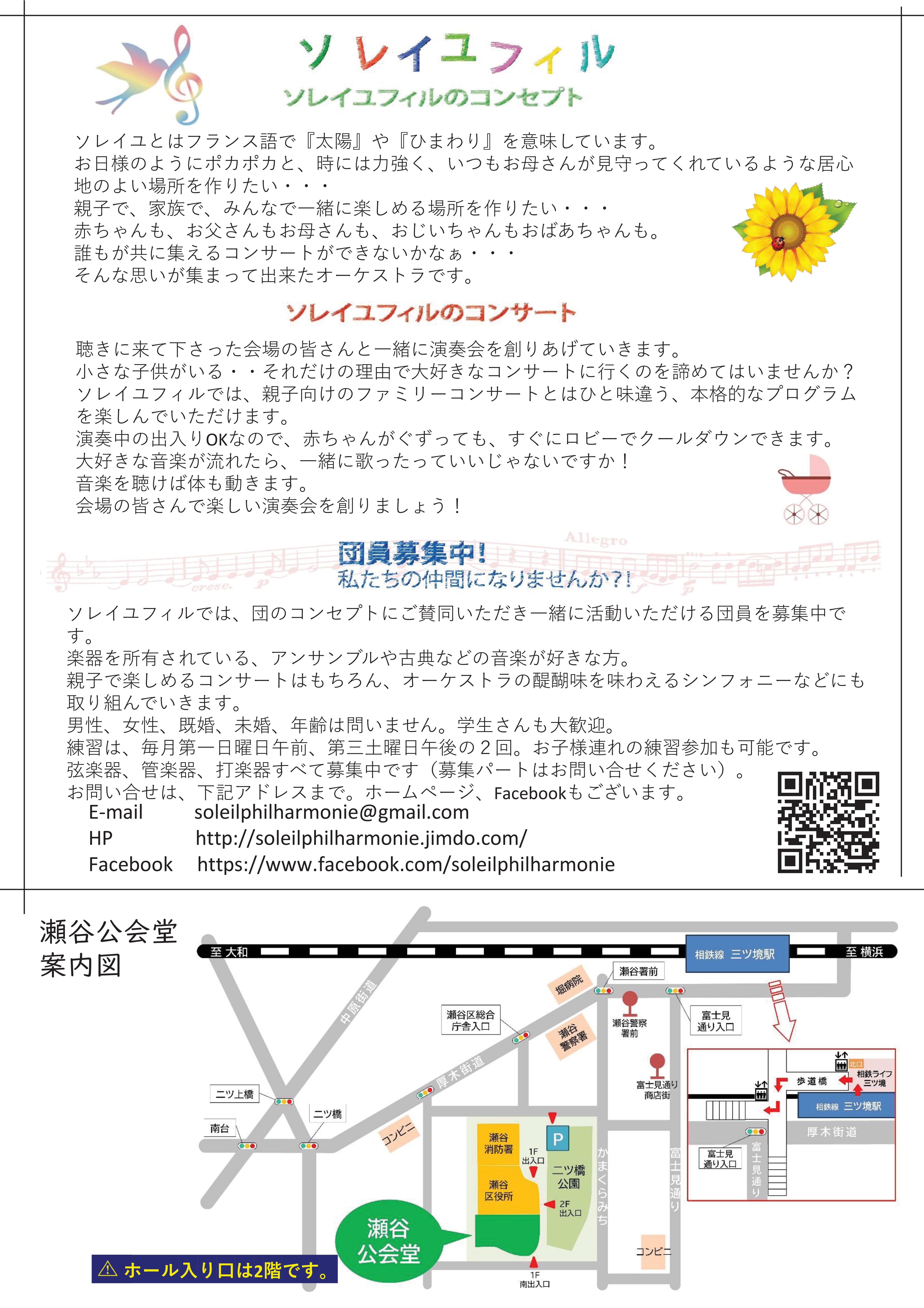 (未就学児歓迎、演奏中の出入り自由)問合せ ソレイユフィルハーモニーオーケストラ