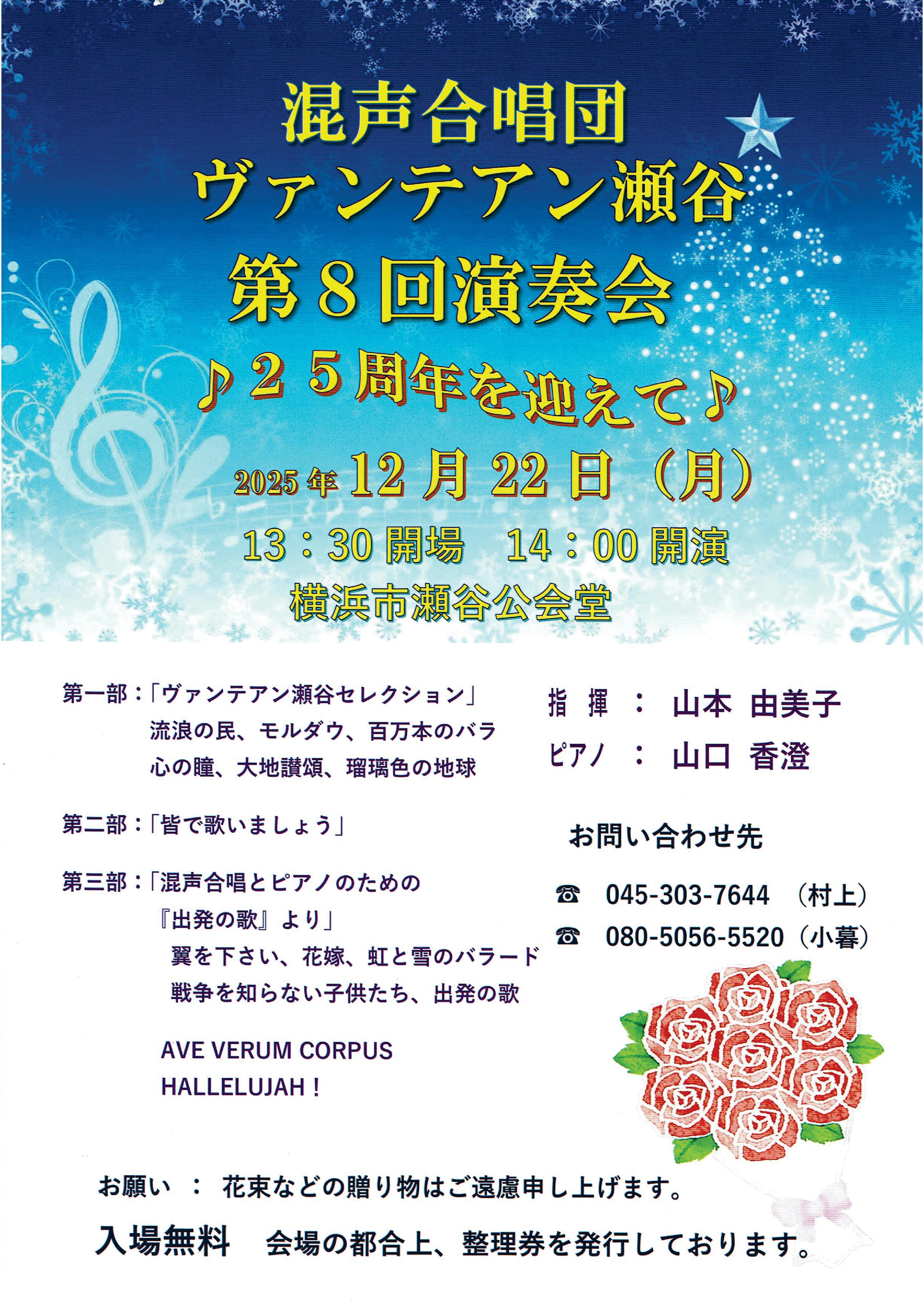 出演:Agape Fellowship Choir 曲目:Hallelujah to the King、明日に架ける橋 他時間 開演 12時(開場 11時40分) 入場料 無料 問合せ 瀬谷区民活動センター