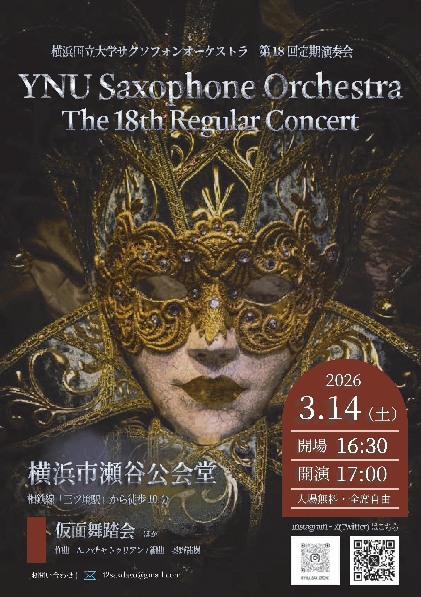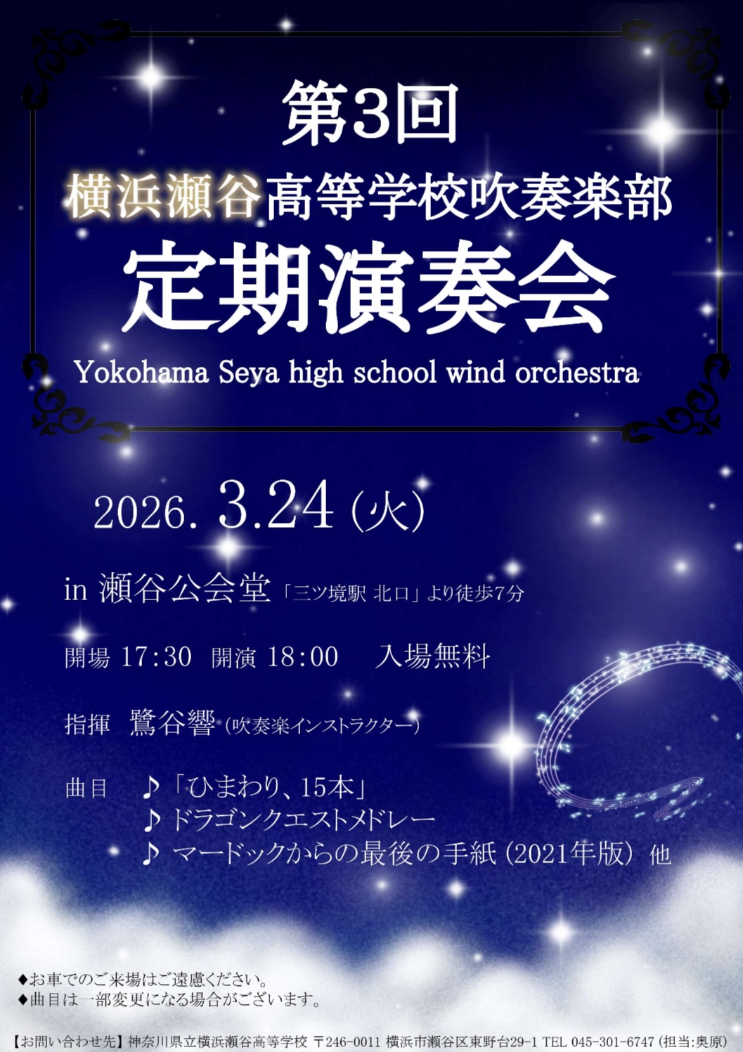 1年間の集大成としての演奏会です!時間 開演 18時(開場 17時30分) 入場料 無料 問合せ 神奈川県立横浜瀬谷高等学校 吹奏楽部
